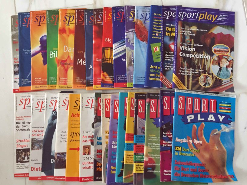 sportplay war ein „Magazin für Dart, Billard, Snooker und Soccer“. Von 1992 bis 1998 habe ich an rund 50 Ausgaben mitgearbeitet, Texte geschrieben und redigiert sowie fotografiert. Gemeinsam mit meinen Mitarbeitern war ich in ganz Deutschland, Europa und Las Vegas unterwegs und habe von Turnieren und Meisterschaften berichtet.