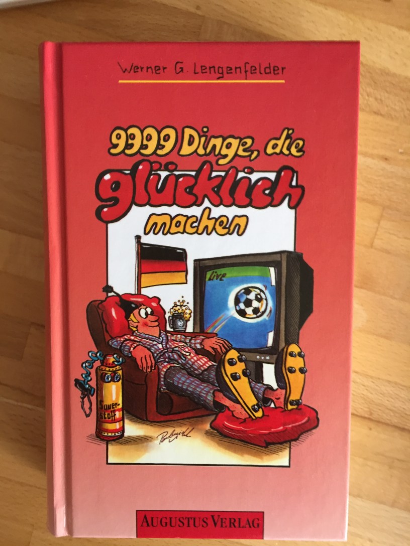 Die Idee zu diesem Buch hatte ich auf einer USA-Reise. Dort fand ich „14.000 things to be happy about“, ein Taschenbuch von Barbara Ann Kipfer. Bei der Suche nach einem Verlag für eine deutsche Version half mir mal wieder mein Freund Gerald Drews. Das Buch erschien 1995 im Augustus Verlag, der zur Weltbild GmbH gehörte. Meine Idee war eher eine esoterische Anmutung des Titels. Als ich dann das Cover mit einer Comic-Zeichnung sah, war ich enttäuscht und entsetzt.