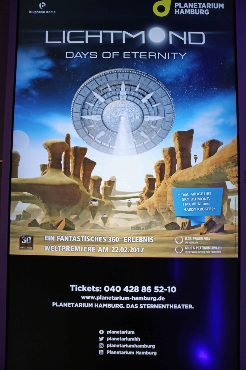Ich war bei der Weltpremiere im Planetarium Hamburg dabei. Die fand übrigens doppelt statt. Per Skype wurde eine Verbindung nach Denver/USA hergestellt. Dort wurde die Show im Rahmen des „Imersa“-Festivals wenige Stunden später aufgeführt und die Macher erzählten von ihren Erwartungen. Für mich äußerst beeindruckend war der geniale Sound mit dem die Musik von Lichtmond im Planetarium erklingt. 70 Lautsprecher sind dafür notwendig. „Days of eternity“ gilt als Referenzproduktion für Surround Sound. Zum Rundumerlebnis wird das Werk, wenn man sich bequem in seinem Sessel zurückfallen lässt und die Bilder im 360-Grad-Format erleben kann.